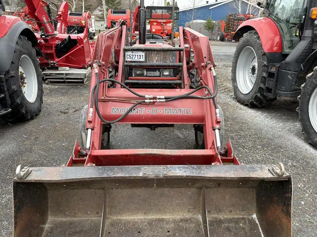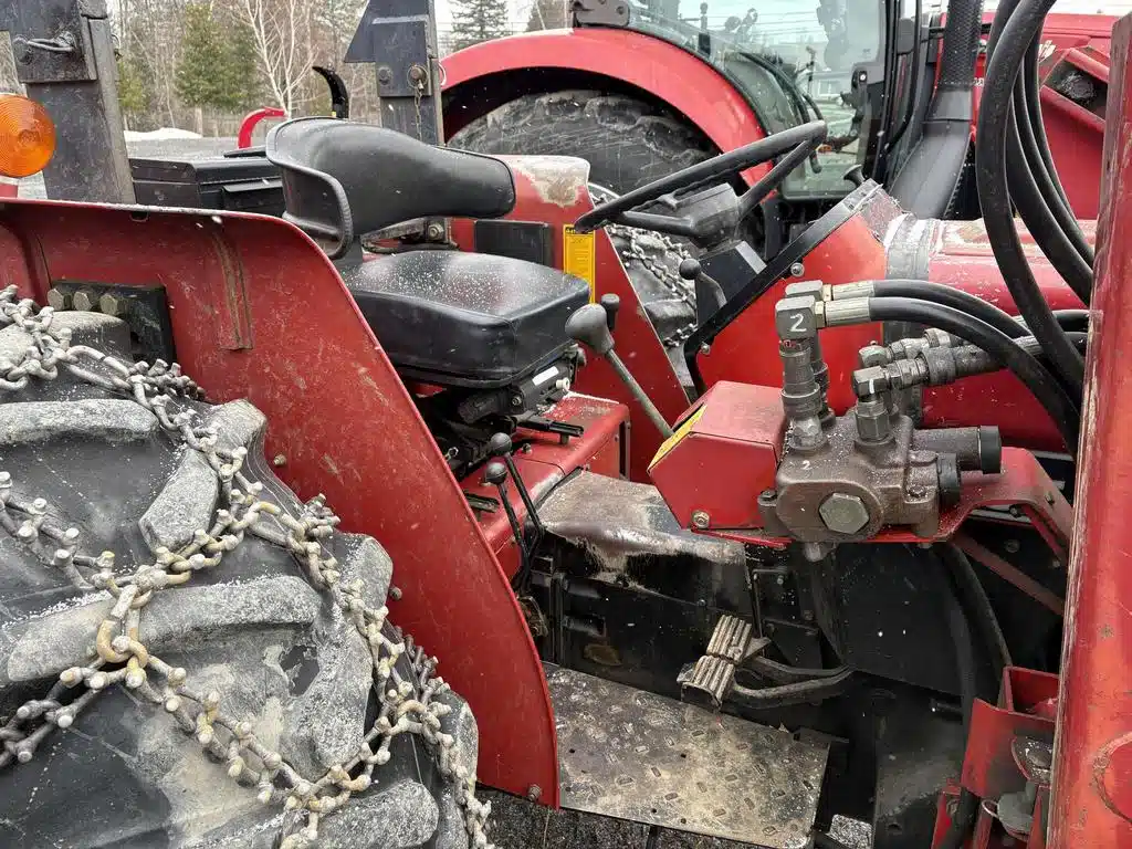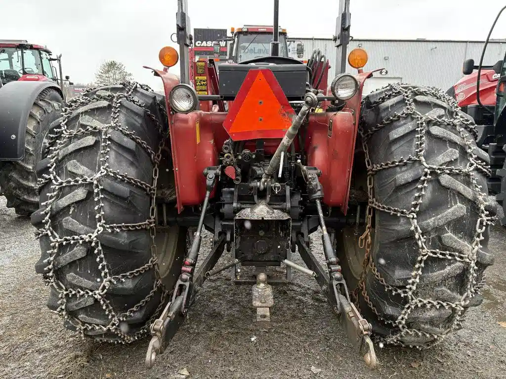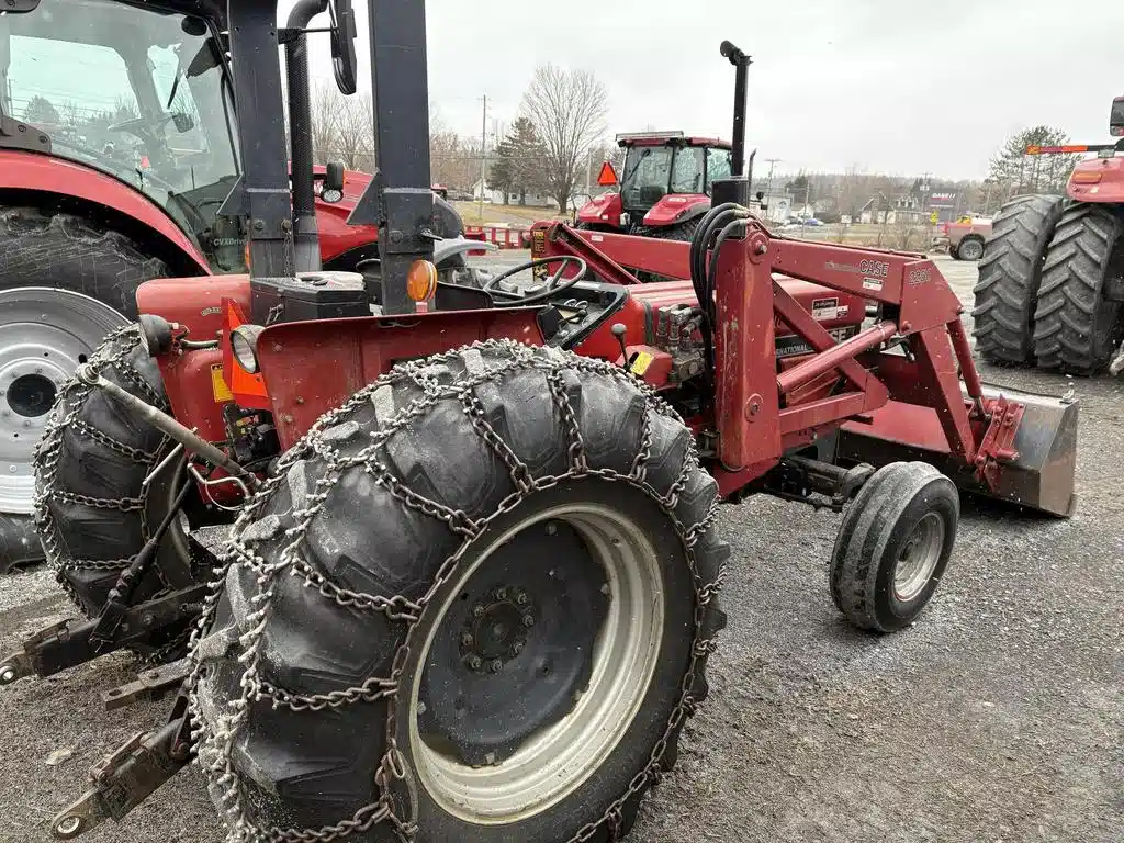 Tracteur Case Internationnal 685, année 1985, moteur 4 cylindres diesel de 68 forces, transmission manuel 8X4, 2WD, PTO 540/1000 de 58 forces, 2 sorties huiles arrière mécanique, poste ouvert, siège avec suspension mécanique, joystick 2 fonctions mécanique, chaine sur les roues arrière, relevage hydraulique arrière télescopique, barre de tir pour remorque.