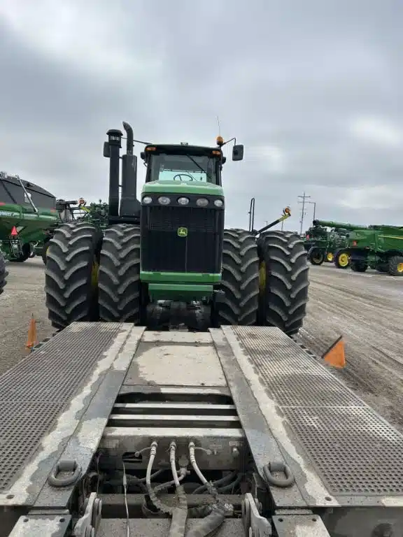 - 4-Wheel Drive Wheel Tractor – Cab with A/C and Heater – Standard Cab – Instructional (Buddy) Seat – Standard Radio – Manual Adjustable Outside Mirrors – 24 Speed Transmission – 710 / 70R 42 Inch Tires – Firestone Brand Tires – Factory Hub Dual Wheels – Four Rear Selective Control Valves (SCV) – 48 Gallon per Minute Hydraulic Pump – No PTO – No Rear 3 Point Hitch – Differential Lock – Front Wheel Weights – Rear Wheel Weights – AutoTrac Ready — Rear 3-Point Hitch: No