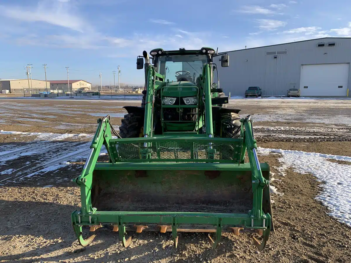 - 2014 John Deere 6140R tractor with H360 mechanically self-levelling loader with grapple, Direct Drive transmission, three rear SCVs, 540/1000 PTO, rear three point hitch, MFWD, factory installed AutoTrac ready kit, 380/85R30 front tires, 480/80R42 rear tires, 2,700 pounds of rear wheel weights, turnable front fenders, and deluxe panorama roof light package. — Turnable Front Fenders for MFWD