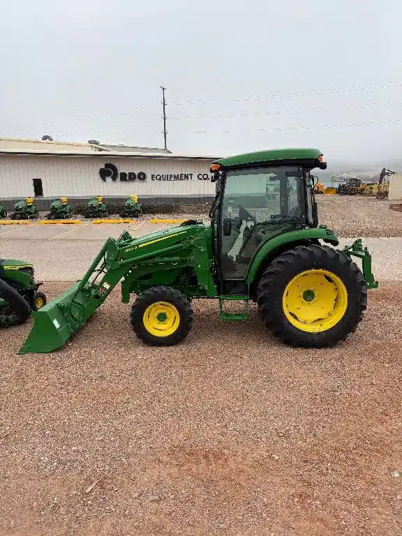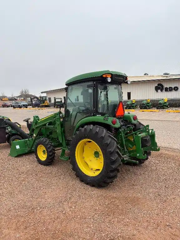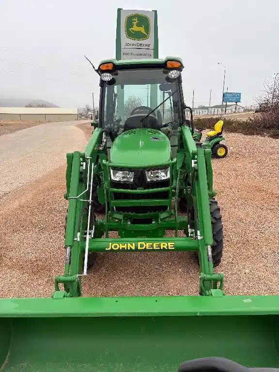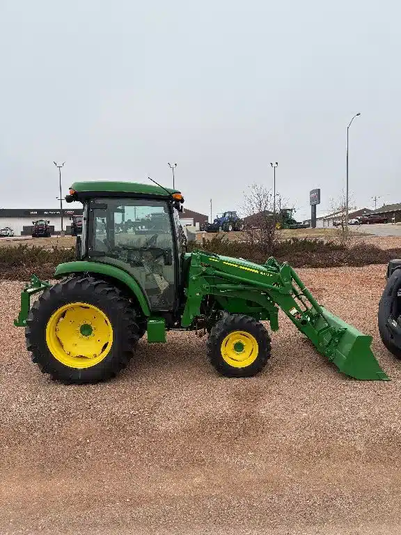- Compact Utility Tractor – 66 Horsepower (Engine) – Liquid Cooled – Four Cylinder – Diesel – Hydrostatic Transmission – Ag Tires (R1) – Mechanical Front Wheel Drive (MFWD) – Rear PTO – 3 Point Hitch – Quick Hitch – Dual Mid Selective Control Valves (SCV) – Single Rear (3rd) Selective Control Valve (SCV) – Cab with Air Ride Seat – Heater – Air Conditioning – Radio – Suspension Seat – Loader with Bucket – CUT Carrier – Bale Spear — Transmission: Hydro