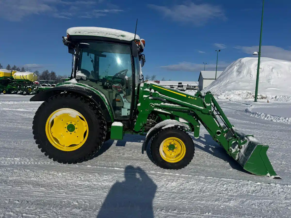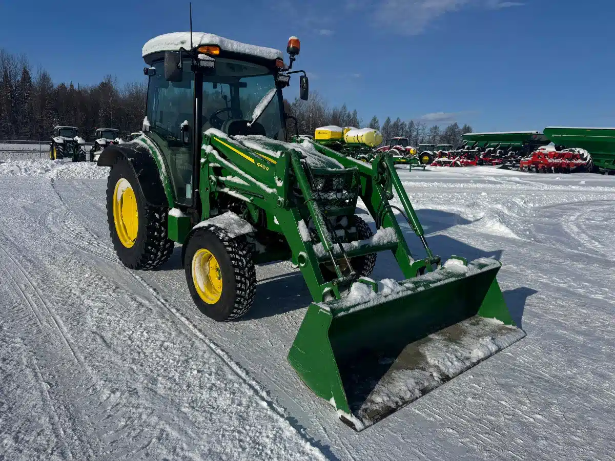 - hydrostatic transmission, snow tires, 2 scv, 3 function joystick, air seat, front fenders + rear extensions, mirrors, bumper, 440R loader, 73in bucket