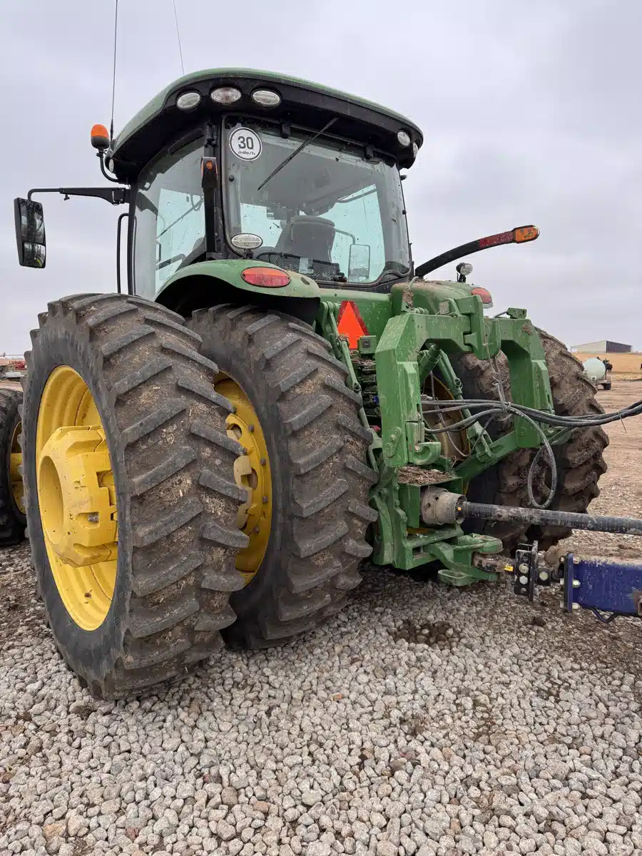 - 2020 JD 8370R Infinitely variable transmission – RH reverser/Independent Link Suspension/Front duals/480/80R50/Rear Duals/60%/Suspended Cab/1000 RPM PTO/5 SCV/2 Pump/8400# — ILS with hydraulic differential lock, wet multi-disk brakes, fully-enclosed driveline and Group 48 Rear Tires